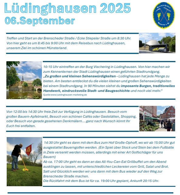 Der Jahresausflug am 6. September 2025 führte uns nach Lüdinghausen. Dieser Tag ist für unseren Verein längst zur schönen Tradition geworden. Ein besonderes Erlebnis, das uns jedes Jahr aufs Neue verbindet und unvergessliche Erinnerungen schafft. In familiärer Atmosphäre wurde Gemeinschaft gelebt, neue Kontakte geknüpft und die Bindung zum Verein gestärkt.